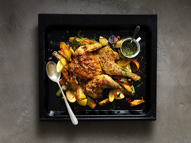 4. Lägg potatis, zucchini, chili, oliver, steklökar och citron i en stor bunke och rör om med några matskedar olivolja, salt och peppar. Lägg upp på samma plåt som kycklingen och ställ in i ugn på 220 grader ca 45 minuter. Kontrollera att kycklingen är färdig intill benet.